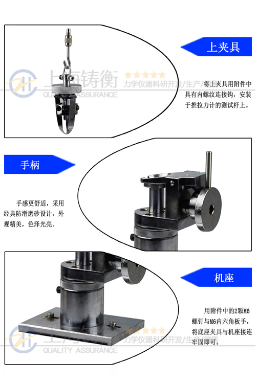 上海鑄衡生產(chǎn)的高精度鈕扣拉力測試儀可配置NK及HF推拉力計(jì)專用夾具,我司高精度鈕扣拉力測試儀專用于測量鈕扣的扣合力或脫離衣物破壞力。檢測鈕扣、按鈕等固定強(qiáng)度是很重要的一項(xiàng)標(biāo)準(zhǔn),尤其是在嬰兒和兒童服裝設(shè)計(jì)及制造中最為重要。在鈕扣固定裝飾件上使用一定力的測量需要通過力度儀器來記錄。